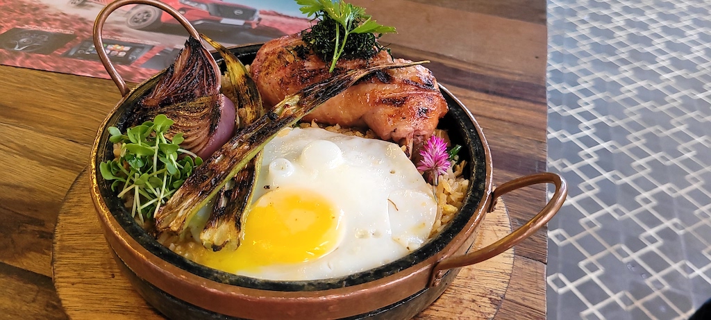 Arroz da galinha é bem apresentado numa panelinha de coxa e sobrecoxa, cebolas e quiabos grelhados e ovo