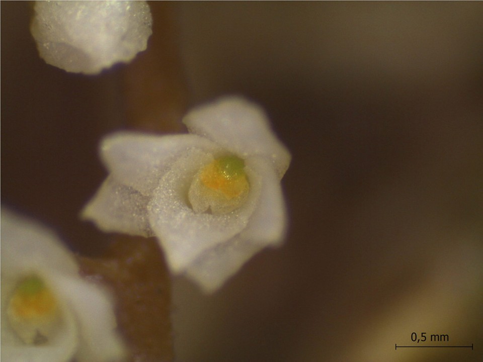 Antes da floração, essa orquídea é um microrramo que se confunde com uma raiz e quando desabrocha aparecem seis pequenas flores com um miolo amarelo e, inicialmente foi confundida com um fungo, pelo pesquisador.