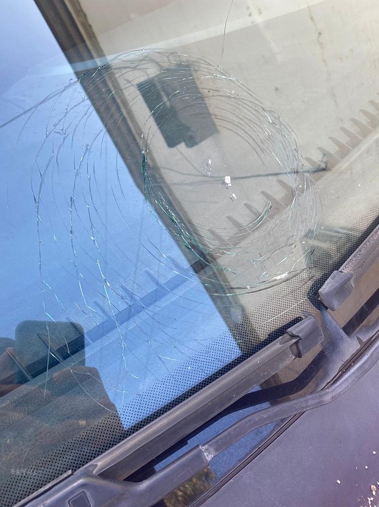 Parabrisa da viatura foi atingido por uma pedra durante a confusão. (Foto: Cortesia / Polícia Militar)