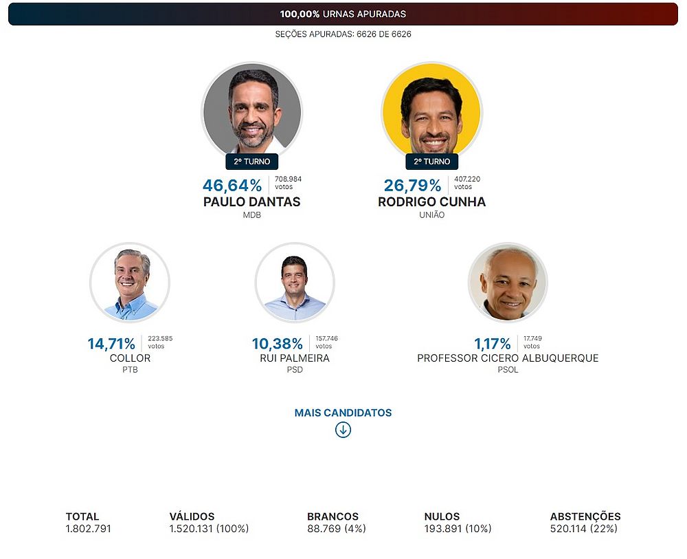 Do total de 1.802.791 votos, os considerados válidos foram de 1.520.131. Já os votos nulos representaram 10% (193.891), enquanto os brancos, 4% (88.769). Os dados são do Tribunal Superior Eleitoral. Clique aqui e veja o resultado da apuração.