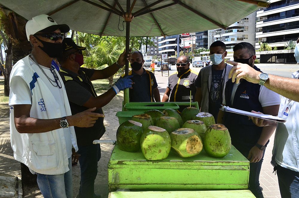 Uma ação da Secretaria Municipal de Segurança Comunitária e Convívio Social (Semscs) junto com Vigilância Sanitária de Maceió (VISA) fiscalizou nesta quinta-feira (2), carros de coco na região da orla de Maceió. Durante a operação os fiscais da Semscs avaliaram o estado de conservação dos carros e se os proprietários tinham o alvará de permissão para a comercialização da fruta. Coube aos agentes da Visa analisarem as condições sanitárias dos cocos que estavam sendo vendidos à população.