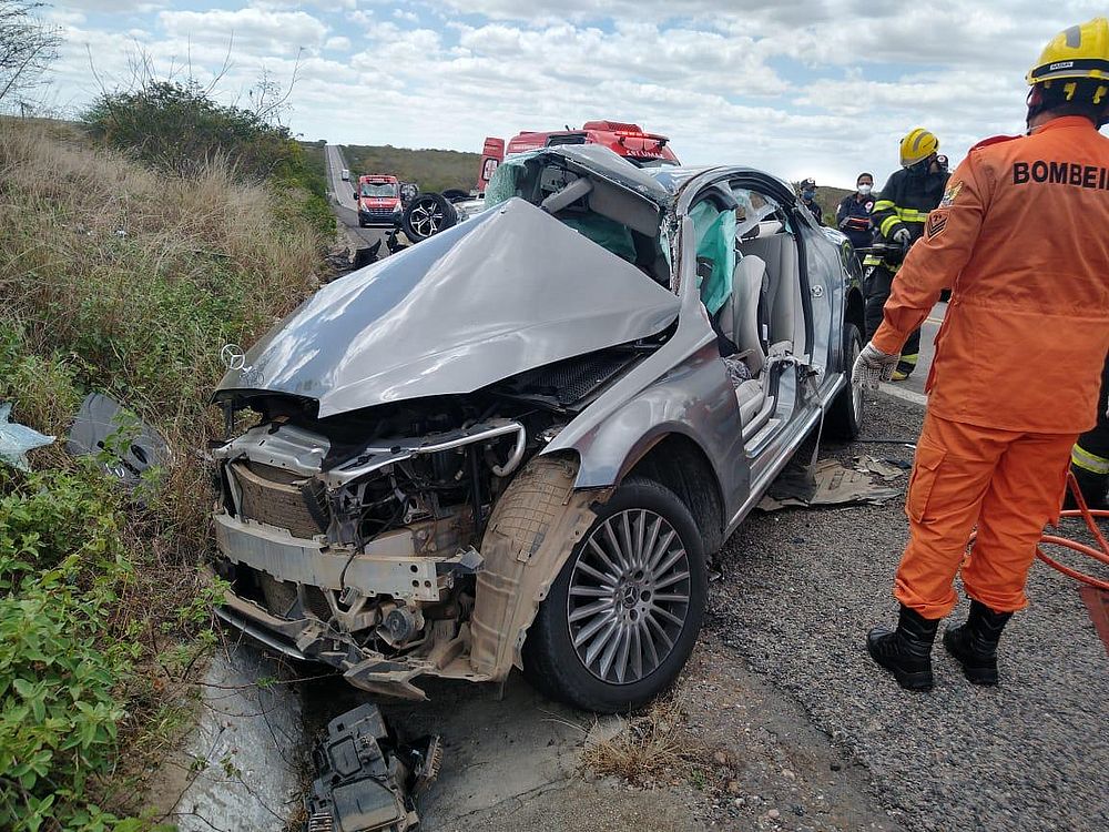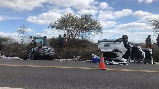 As placas dos veículos envolvidos, sendo aparentemente um Kia Sportage e um Mercedes, são de Feira de Santana/BA e de Recife/PE. Os automóveis ficaram totalmente destruídos.
