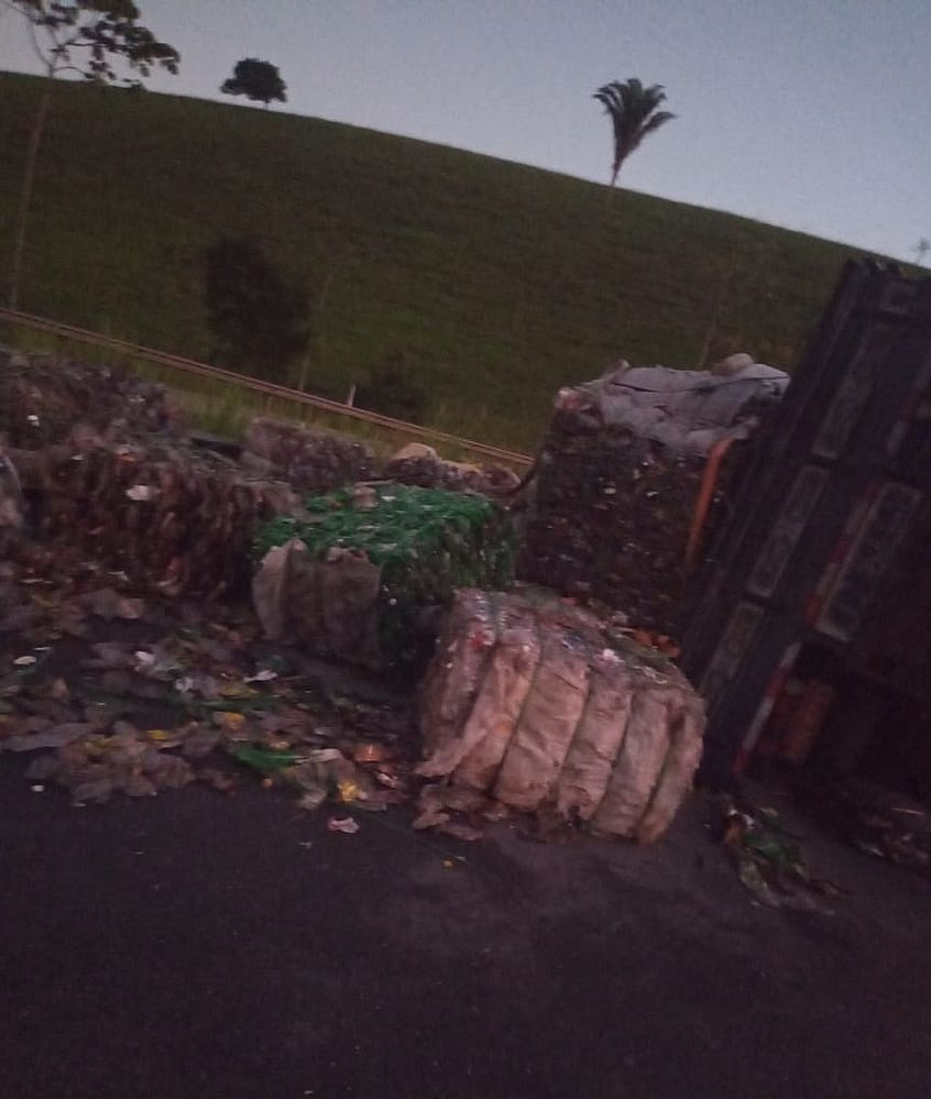 Um caminhão transportava mandioca, enquanto outro estava com carga de materiais recicláveis. Não há informações sobre o carregamento do terceiro veículo. Parte da carga ficou espalhada na pista depois do acidente.