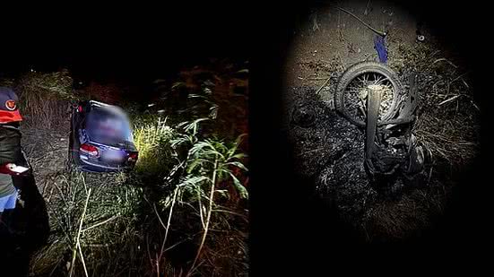 Com o impacto, o carro saiu do asfalto e parou na área de vegetação às margens da rodovia. A moto também foi jogada para fora da pista e pegou fogo com a colisão. Antes do incêndio, ela já havia ficado destruída.