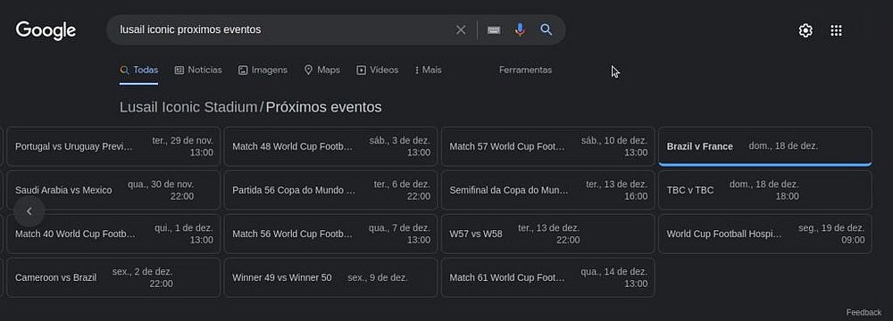 Ao digitar na pesquisa o termo “Lusail Iconic próximos eventos”, o Google, além de trazer resultados sobre o estádio que sediará a final da Copa, traz também uma lista com todos os jogos do Mundial que serão disputados no local.