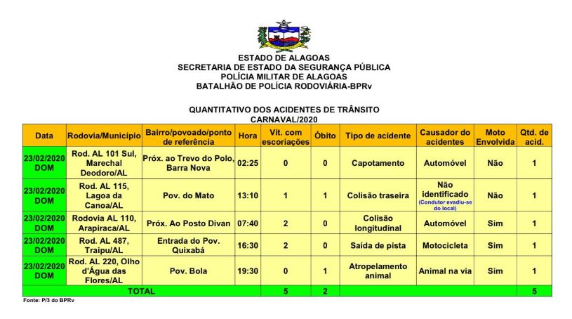 Pelo menos quatro pessoas morreram em acidentes de trânsito nas últimas 24h em Alagoas, durante o Carnaval. De acordo com dados divulgados pelo Batalhão de Polícia Rodoviária (BPRv) cinco acidentes foram registrados nesse domingo de Carnaval, em rodovias alagoanas.