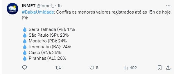 Ainda segundo o Instituto, a cidade de Piranhas, também localizada no Sertão do São Francisco, registrou 37,5°C — quinta maior temperatura do país nesta sexta. O município de Piranhas ainda teve uma das menores umidades do dia (26%).