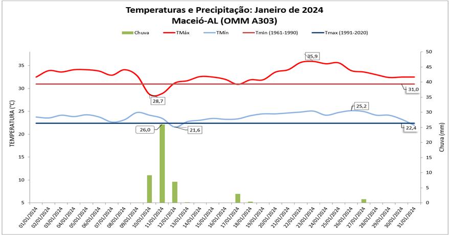 De acordo com o balanço divulgado pelo órgão, a capital alagoana registrou entre os dias e 22 e 25 de janeiro máximas diárias acima de 35°C. No dia 25, os termômetros chegaram a registrar 35,9°C, e Maceió foi a segunda capital mais quente do Brasil.