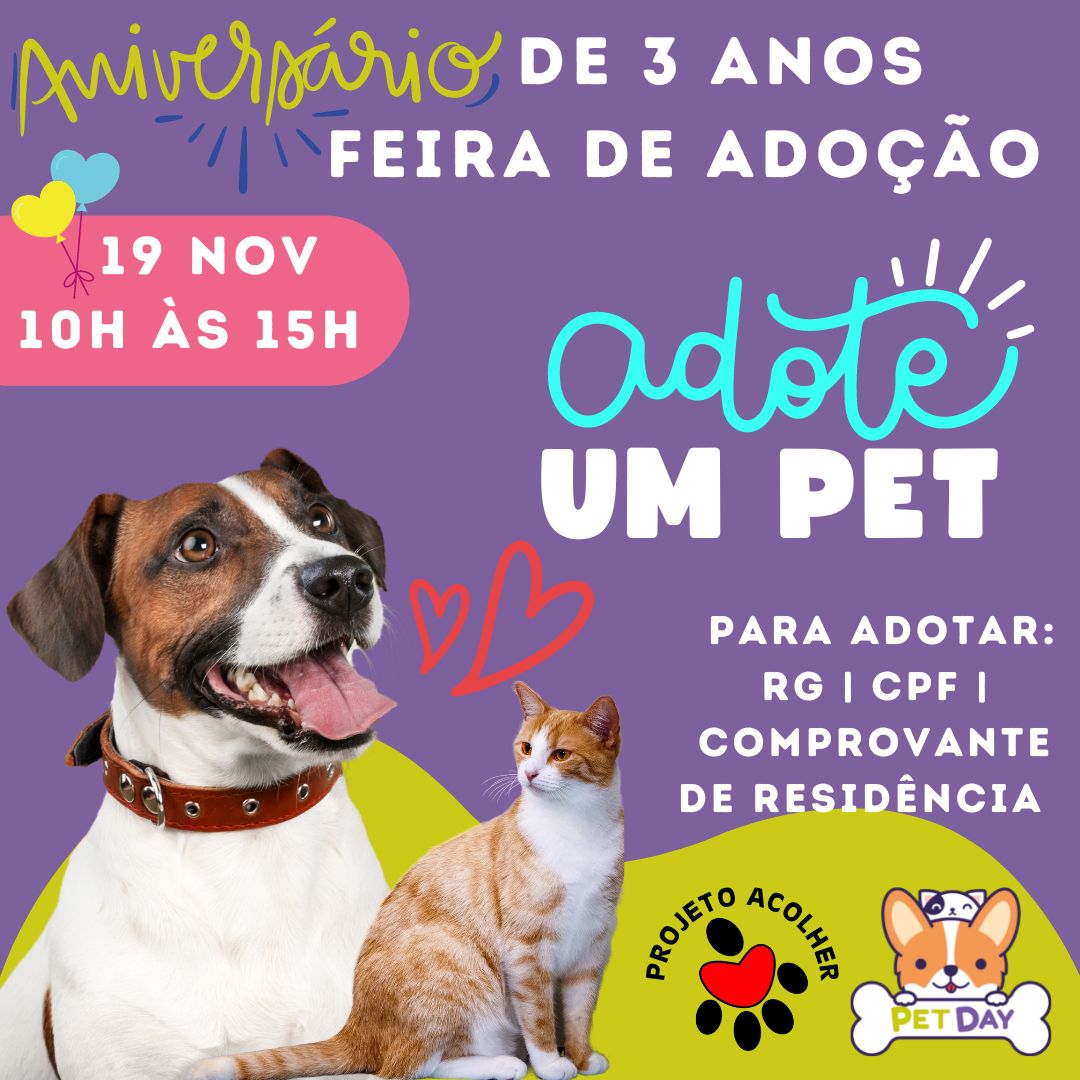 Aproveito e convido você que está pensando em adotar um pet que compareça nas feiras de adoção onde o Projeto Acolher levará bichinhos lindos e super amorosos. No dia 12 de novembro, das 9h às 13h, vai acontecer um evento para adoção de cães e gatos no estacionamento da UNINASSAU, na rua José de Alencar, nº 511, no bairro do Farol. Já no dia 19 de novembro, das 10h às 15h, será a vez do Pet Day, que fica na Av. Capitão Marinho Falcão, 105, Santo Eduardo, realizar o evento onde serão disponibilizados cães e gatos, filhotes e adultos, vacinados, vermifugados e castrados. Na oportunidade o pet shop vai comemorar três anos de existência e está arrecadando junto aos clientes ração e sachê para doar ao Projeto Acolher.