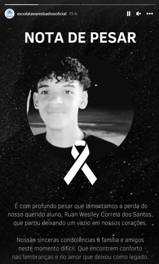 "É com profundo pesar que lamentamos a perda do nosso querido aluno Ruan Weslley Correia dos Santos, que partiu deixando um vazio em nossos corações. Nossas sinceras condolências à família e amigos neste momento difícil. Que encontrem conforto nas lembranças e no amor que deixou como legado", diz a mensagem do grêmio estudantil compartilhada no perfil da escola.