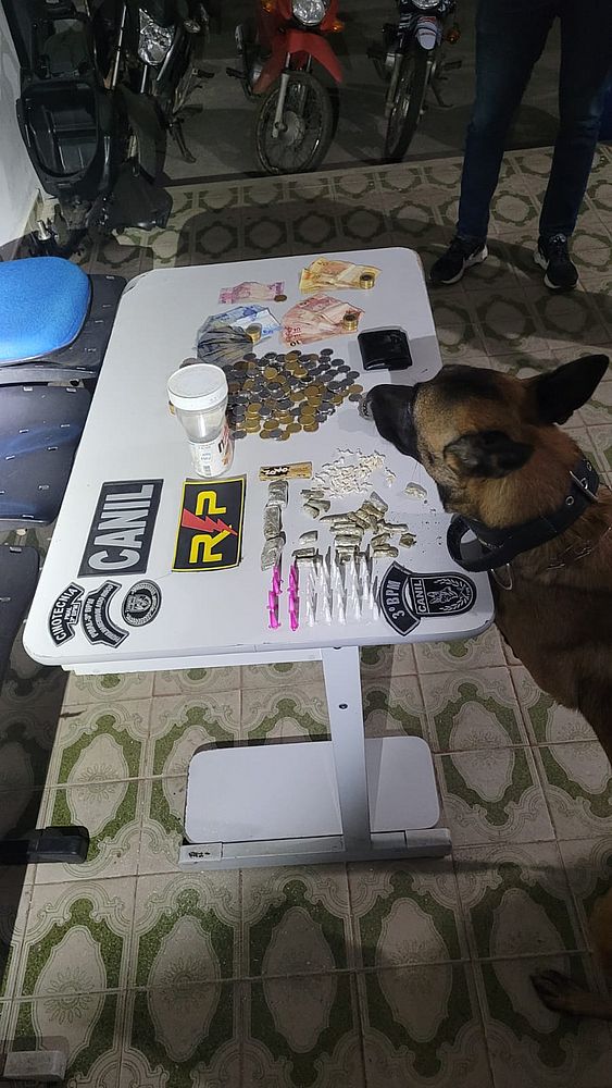 Com a adolescente, uma bombinha de maconha foi encontrada. Ela admitiu aos militares que tinha acabado de usar cocaína. A equipe deu início às buscas na residência e contou com o auxílio do cão policial KAOS para localizar os entorpecentes, que estavam ao lado do imóvel, em telhas no chão.