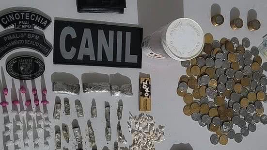 Ao todo, foram encontradas 26 bombinhas de maconha, 34 pinos de cocaína e 48 pedras de crack. Os policiais ainda flagraram dinheiro trocado, em moedas e cédulas de papel, o que totalizou a apreensão de R$ 310,75. O material foi recolhido e entregue na delegacia.