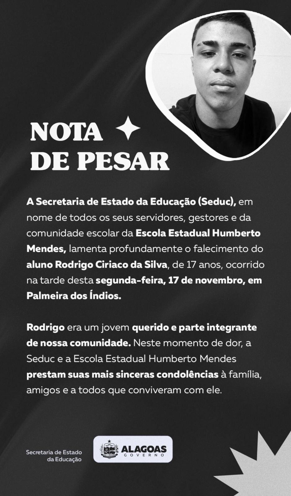 A Seduc expressou suas condolências em uma nota nas redes sociais, destacando a importância de Rodrigo para a comunidade escolar e lamentando a perda junto à família e amigos.
