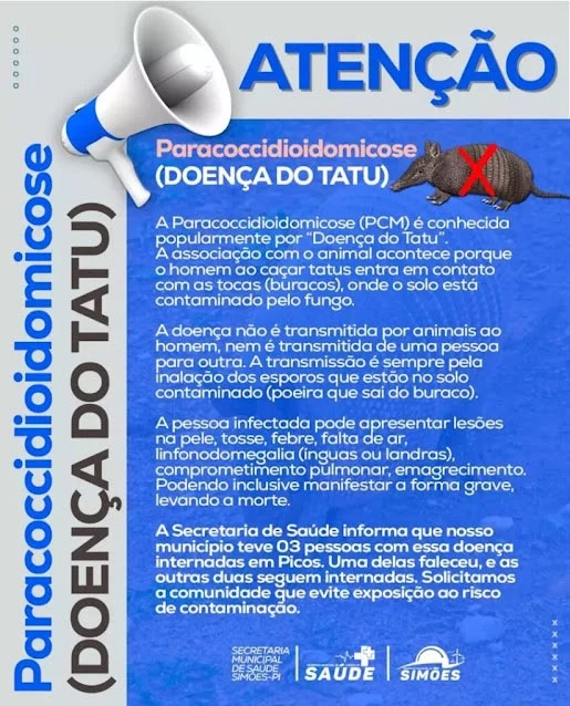 “Tem mais de um mês que eles fizeram uma caçada, me parece que em torno de 4 pessoas, e depois começaram a apresentar os sintomas. Foram ao médico e mandaram para Picos que confirmou a contaminação. Eles inalaram o fungo do Tatu. Esse fungo fica na terra, nas tocas desses animais”, afirmou a secretária.