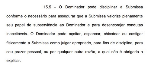 Além disso, o contrato prevê que "o dominador pode açoitar, espancar, chicotear ou castigar fisicamente a submissa como julgar apropriado, para fins de disciplina, para seu prazer pessoal, ou por qualquer outra razão, a qual não é obrigado a explicar".