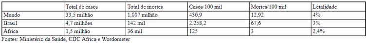 Nos óbitos pela doença, os registros na África estão perto de 36 mil, pouco mais do que no estado de São Paulo, que tem população de 46 milhões. A taxa de mortalidade por covid-19 no Brasil está em 67,6 por 100 mil habitantes e a letalidade da doença é de 3%. No Continente Africano, a mortalidade por covid-19 é de 3 por 100 mil habitantes e a letalidade da doença de 2,4%.