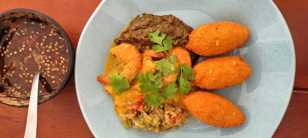 Uma das estrelas é o Acarajé da Luz” (nome dado por mim) – bolinho de feijão fradinho, vatapá, caruru, vinagrete e camarão refogado.