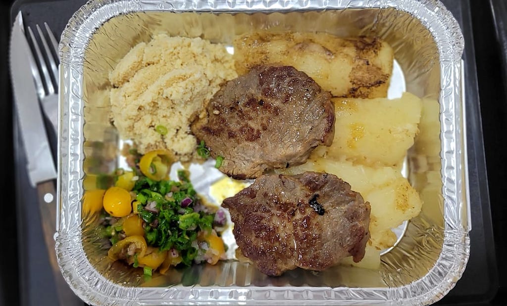 Um dos destaques da casa também é o tradicional cuscuz de milho com filé de suíno de carne de sol, uma produção do próprio chef Ramiro, ela é macia e suculenta, perfeita para acompanhar o cuscuz refogado, fofo e molhadinho. O quitute nordestino é pra sempre. Mas a carne de sol também tem a opção com macaxeira, farofa e vinagrete.