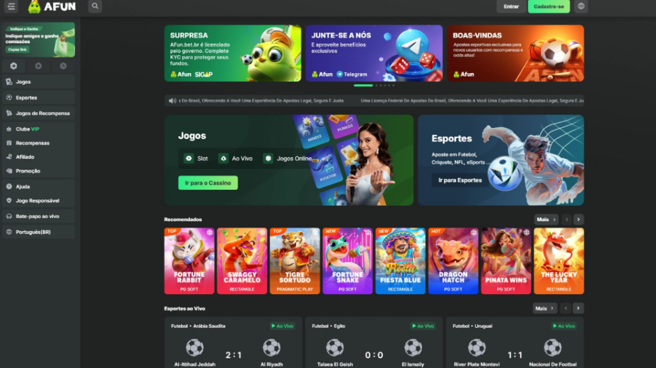 A Afun oferece um portfólio completo de modalidades esportivas, com ênfase em campeonatos populares como Brasileirão, Libertadores, Premier League, La Liga e muito mais. O sistema da plataforma é projetado para usuários brasileiros, com funcionalidades modernas como: