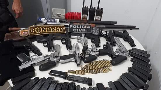 Ao chegar no imóvel indicado pelo denunciante, os policiais flagraram 12 homens armados. Com o grupo foram apreendidos duas espingardas calibre 12, 10 pistolas calibres 9mm, 40 e 380, três revólveres calibre 38, carregadores, munições, rádios comunicadores e dois veículos.