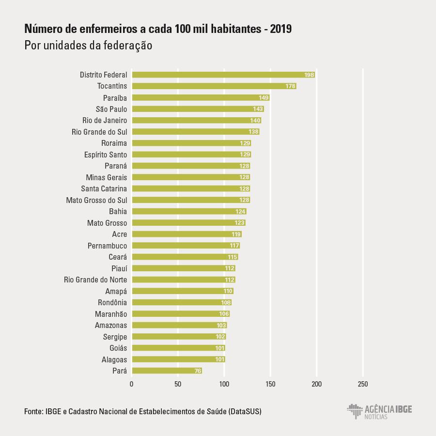 O Instituto Brasileiro de Geografia e Estatística (IBGE), divulgou no último dia 07 dados sobre a distribuição de médicos e enfermeiros no Brasil. Os números mostram que em Alagoas há 101 enfermeiros para 100 mil habitantes, o que faz o estado figurar no penúltimo lugar do ranking, perdendo apenas para o estado do Pará.