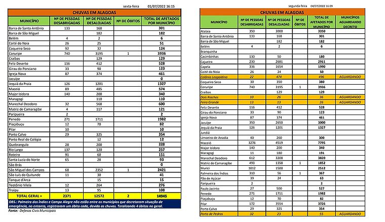A capital Maceió, por exemplo, tinha 574 pessoas nessa situação na sexta-feira e agora registra 7.795 pessoas afetadas, um aumento superior a 7 mil. Rio Largo também saiu de 257 desabrigados ou desalojados para 7 mil.