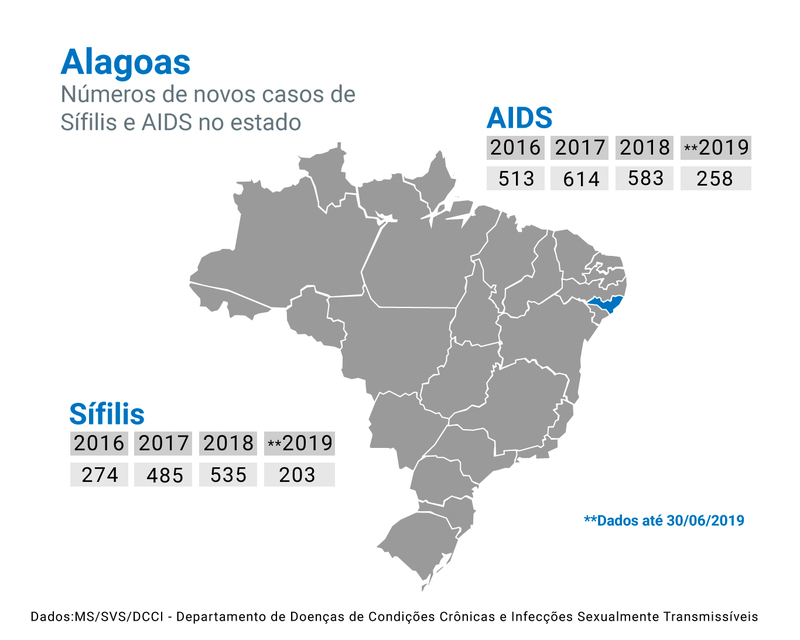 Além do HIV e da Aids, o estado de Alagoas registrou 203 casos de sífilis, no primeiro semestre do ano passado, e nos últimos 10 anos foram 1.796 casos registrados. As hepatites virais mataram 496 alagoanos, de 2000 a 2017.