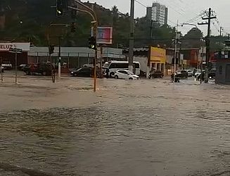 A parte mais próxima do canteiro e a mais próxima da calçada estão cheias de água e não dão condições para o trânsito de veículos e pedestres. A orientação de quem passa pelo local é esperar a água escoar.