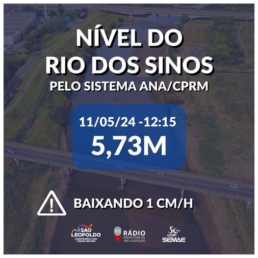 ![]() Atualização da Prefeitura de São Leopoldo sobre o Rio dos Sinos neste sábado, 11 de maio de 2024 (Foto: Divulgação) |