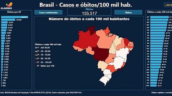 No caso do número de óbitos por 100 mil habitantes, a variação é semelhante. O estado saiu do 11º lugar em junho, com taxa de 15,16, para figurar na 20ª posição, com 65,40.