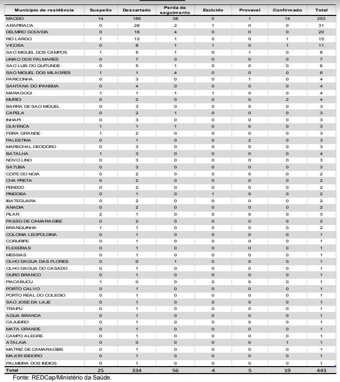 Foram excluídos 04 casos por não atenderem definição proposta pelo Ministério da Saúde dos seguintes municípios: Arapiraca, Pindoba, Maragogi e Viçosa. Veja o boletim completo.