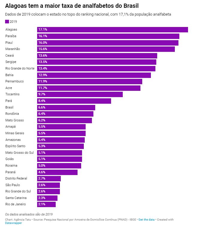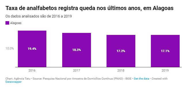 O simples fato de ler, seja um livro, essa reportagem ou um recado não faz parte da realidade de 17,1% da população de Alagoas, estado com maior taxa de analfabetos do país. É o que apontam os dados analisados pela Agência Tatu e extraídos da Pesquisa Nacional por Amostra de Domicílios Contínua (PNAD) de 2019.