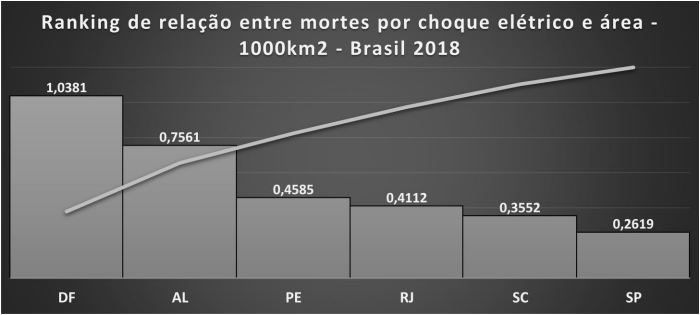Entretanto tudo muda quando se relaciona o número de mortes por choque elétrico à área do estado. Alagoas pula para 1º lugar no Nordeste: