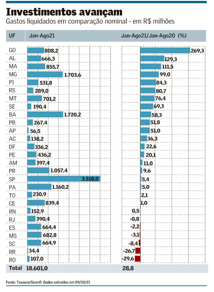 Alagoas ocupa o 2º lugar da lista dos entes federativos que mais aumentaram em investimentos e arrecadação, ficando atrás apenas de Goiás. Esta avaliação nacional foi feita pelo jornal Valor Econômico com publicação nesta segunda-feira (11). Dos 27 entes, em 21 houve crescimento nominal de investimentos de janeiro a agosto de 2021, comparando com iguais meses de 2020. A alta superou os 10% em 15 deles. Goiás, Alagoas e Maranhão estão entre os entes que mais cresceram em investimentos.