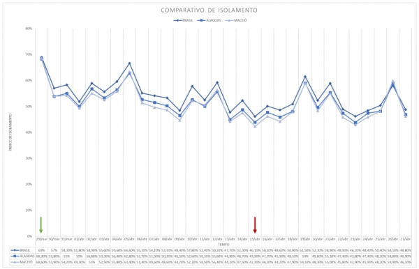 “O Governo do Estado tem acompanhado de perto os dados de isolamento. Esse monitoramento é essencial para que possam ser definidas as diretrizes e as resoluções mais adequadas para a população. Em geral, temos conseguido manter uma taxa média de afastamento acima de 50% em Alagoas, mas é essencial reforçar o pedido para que, quem puder, permaneça em casa. Esse é o momento de cuidarmos uns dos outros, ainda podemos melhorar esse resultado e assim garantir que o menor número possível de pessoas seja contaminado com o vírus no nosso estado”, salienta Rafael Brito.