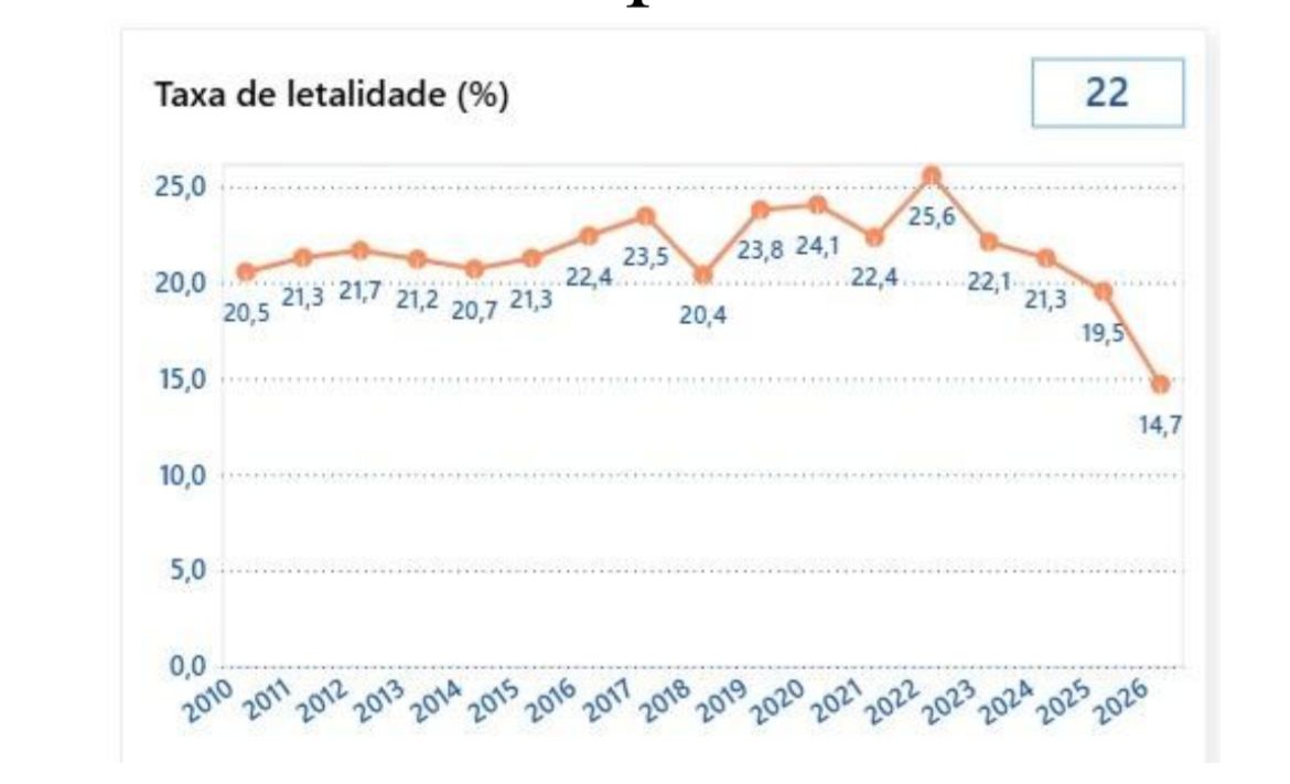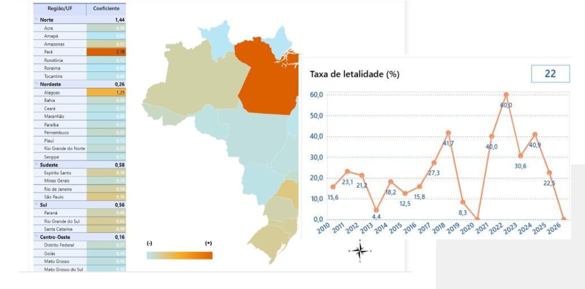 Se a incidência já acende um alerta, os indicadores de letalidade do Ministério da Saúde tornam o cenário ainda mais preocupante: o gráfico nacional (esquerda) mostra que, no Brasil, o pico recente de letalidade da doença meningocócica ocorreu em 2023, quando o índice atingiu 25,6%. Isso significa que, naquele ano, aproximadamente um em cada quatro casos evoluiu para óbito.