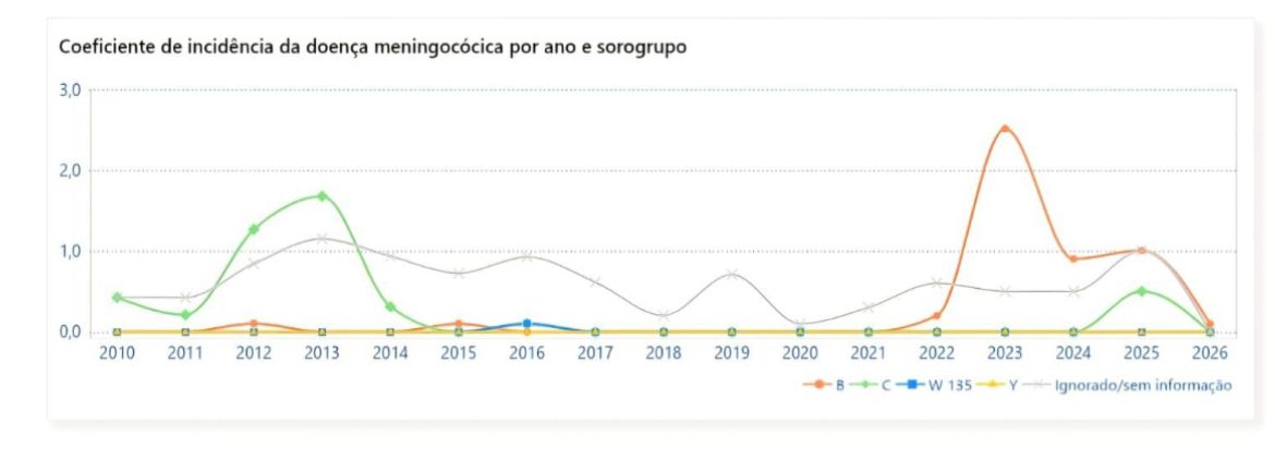 O gráfico do Ministério da Saúde (MS), de coeficiente de incidência da doença meningocócica em Maceió, por sorogrupo, mostra, de forma bastante clara, o impacto da vacinação na prevenção da meningite. A linha verde representa os casos de meningite do tipo C. Ao longo do período analisado, é possível observar dois picos distintos de incidência: o primeiro em meados de 2013 e o segundo mais recente, que está ocorrendo desde o final de 2025.
