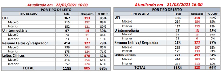 Dos 367 leitos de UTI para Covid em Alagoas, 313 estão com pacientes em tratamento, o que resulta em 85% de ocupação no estado. Em Maceió, 192 leitos dos 215 disponíveis estão ocupados. No interior, dos 152 leitos, 121 estão sendo utilizados.
