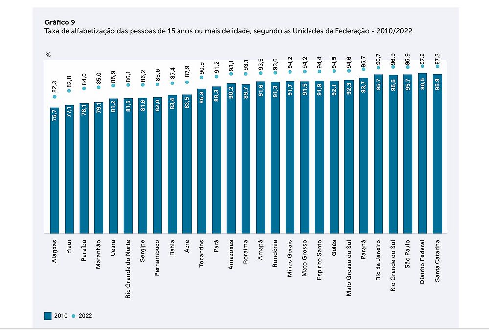 Segundo os dados do último Censo do IBGE, no período de 2010 a 2022, a taxa de alfabetização de pessoas adultas em Alagoas passou de 75,7%, em 2010, para 82,3% em 2022 — o que representa uma queda de 6,6 percentuais. Com isso, Alagoas registrou a maior redução em pontos percentuais da taxa de analfabetismo de pessoas acima de 15 anos de idade entre os estados brasileiros.