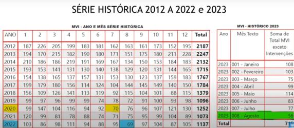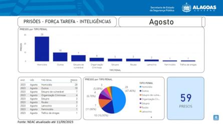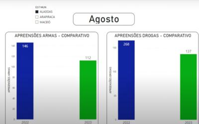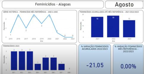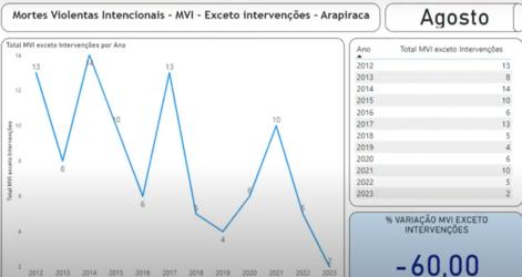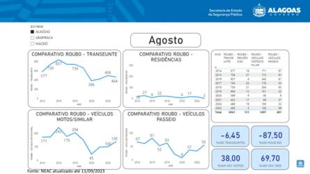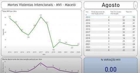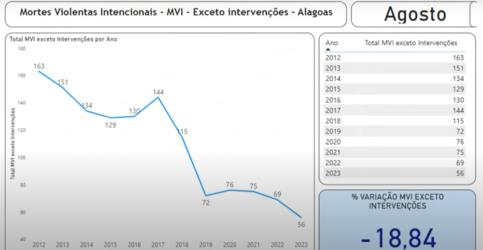 Índices em queda - Uma das principais quedas nos dados de criminalidade divulgados pela SSP estão no número de mortes violentas intencionais. De acordo com os gráficos (veja no final da matéria), Alagoas atingiu o melhor número da série histórica, registrada desde 2012. Em agosto de 2023, o estado registrou 56 mortes por MVI. O número não conta com intervenções policiais.