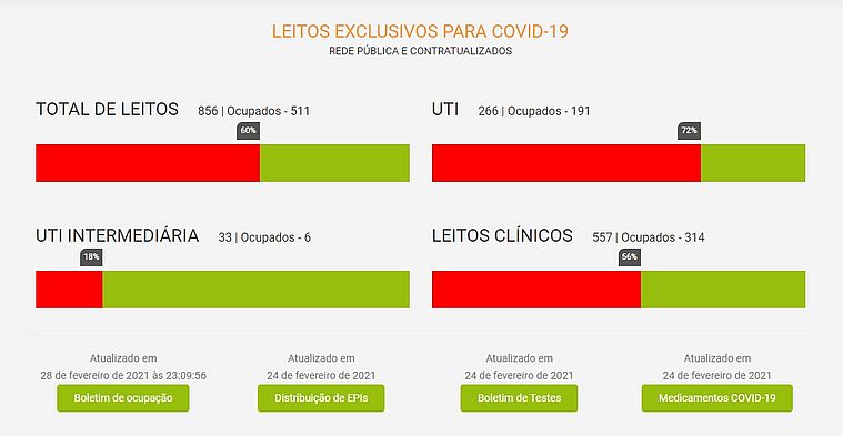 Leitos de Covid-19 do Estado – Dos 856 leitos criados pela Secretaria de Estado da Saúde (Sesau) para atender, exclusivamente, pacientes com suspeita e confirmação de infecção pelo novo coronavírus, 511 estavam ocupados até às 16 horas do domingo (28/02), o que corresponde a 60% do total. Atualmente, 191 pacientes estão em leitos de UTI, 06 ocupando leitos intermediários e 314 em leitos de enfermaria. Para acompanhar a evolução da ocupação dos leitos exclusivos para Covid-19, acesse http://www.alagoascontraocoronavirus.com.br/.