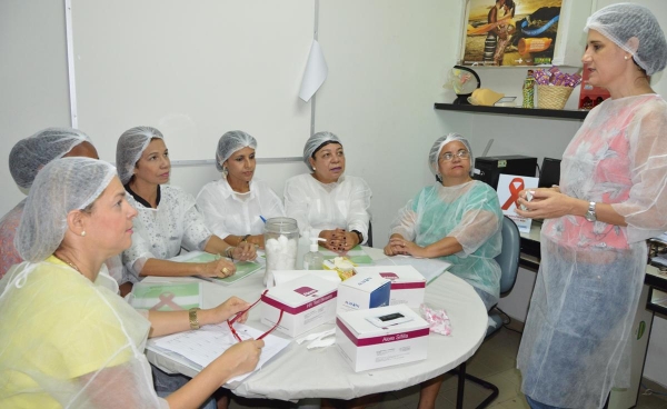 Sheila dos Anjos (em pé) ressalta que técnicos municipais são treinados para a realização do diagnóstico da Aids (Crédito: Carla Cleto)