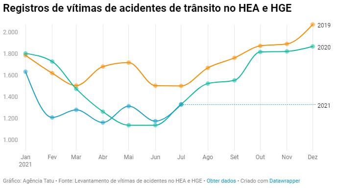 Levando em consideração o período de janeiro a julho dos três anos, é possível observar uma redução no número de acidentes: o ano de 2019 contabilizou 4.577 ocorrências, no ano de 2020 foram 3.977, já o ano de 2021 atendeu vítimas de 3.343 acidentes de trânsito.