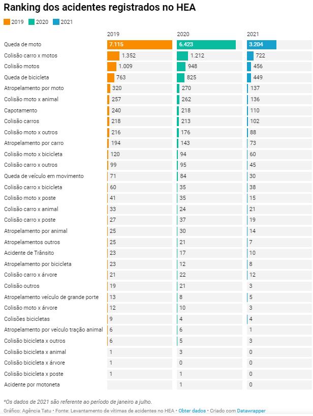 De janeiro a julho deste ano foram registrados 3.343 acidentes com feridos atendidos no HGE. As principais causas dos acidentes seguem as mesmas: moto (1.408), colisão (1.211) e atropelamento (370).