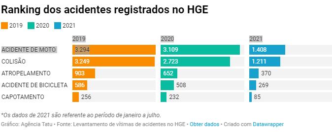 Segundo os dados, os tipos de acidentes de trânsito mais comuns onde feridos foram atendidos pelo HGE, em 2019, foram os que envolviam motos, colisões e atropelamentos. Foram 3.294, 3.249 e 903 registros, respectivamente. Um total de 8.288 acidentes registrados.