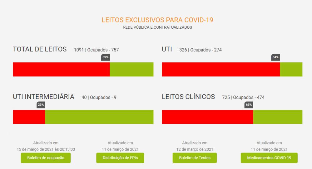 Passados oito dias do anúncio das medidas mais rígidas para o enfrentamento à Covid-19 no estado, a taxa de ocupação de leitos hospitalares de UTI, um dos principais pontos para nortear ações de controle da transmissão da doença, segue em alta e marcou 84%, segundo a última atualização da Secretaria de Estado de Saúde (Sesau), na tarde dessa segunda-feira (15).
