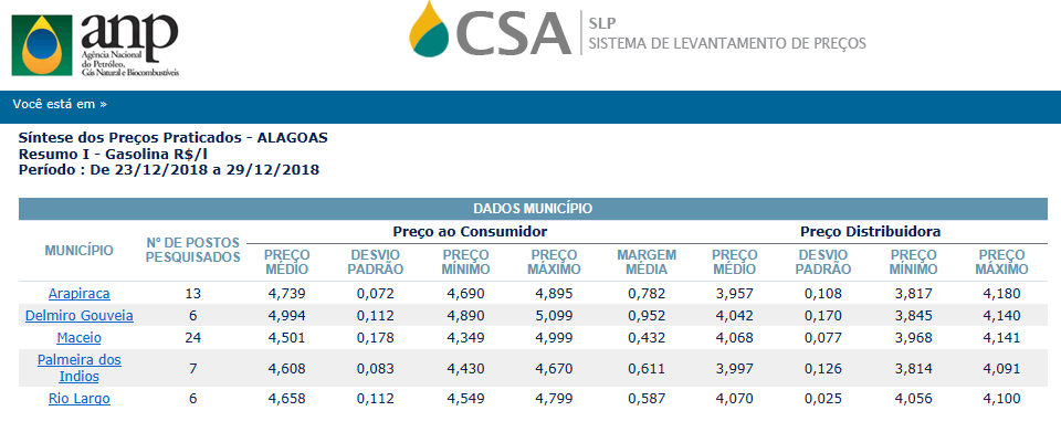 Na última semana de dezembro o preço médio na região nordeste foi de R$ 4,379 enquanto em Alagoas essa média foi de R$ 4,578.