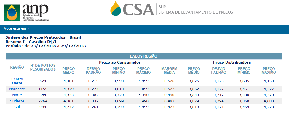 Preço médio do litro da gasolina nas cinco regiões brasileiras na semana de 23 a 29/12/2018 | Fonte: ANP
