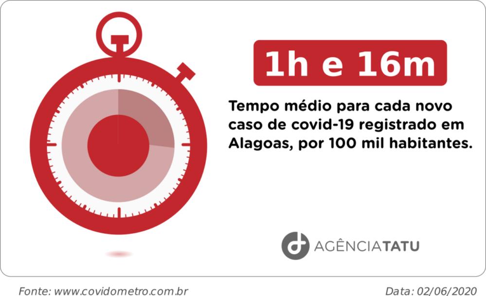 Alagoas também se destaca, na terceira posição entre os estados do Nordeste, quanto à velocidade de óbitos: uma vítima a cada 1 dia, 19 horas e 48 minutos, de acordo análise feita na última quarta-feira (03). Os cálculos, extraídos do Covidômetro no dia 1º de Junho, são feitos considerando a proporção para cada 100 mil habitantes, com registros a partir do dia oito de março, e atualizados constantemente. Por esse motivo, podem apresentar variação de um dia para o outro.