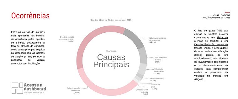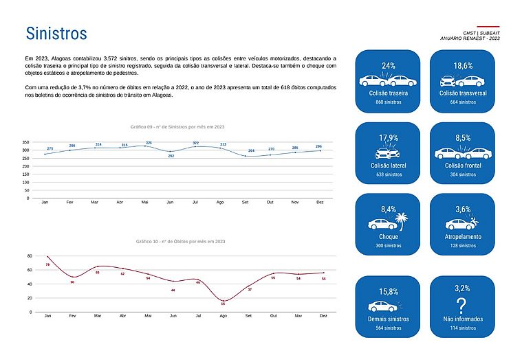 "Sendo os principais tipos as colisões entre veículos motorizados, destacando a colisão traseira o principal tipo de sinistro registrado, seguida da colisão transversal e lateral. Destaca-se também o choque com objetos estáticos e atropelamento de pedestres. Com uma redução de 3,7% no número de óbitos em relação a 2022, o ano de 2023 apresenta um total de 618 óbitos computados nos boletins de ocorrência de sinistros de trânsito em Alagoas".